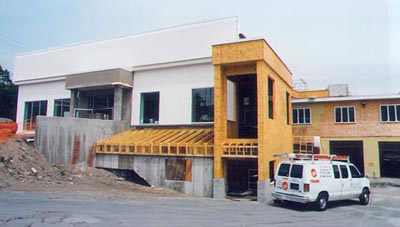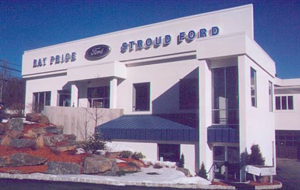 Construction on Ray Price Stroud Ford began in 1999 and is almost complete. The work included demolition of the existing showrooms and creation of new offices and modern showrooms. Complete renovation of exterior and addition of new Butler pre-engineered service bays completed the facility. This photo shows the west elevation of showroom entrance and stairwell to the second floor. |